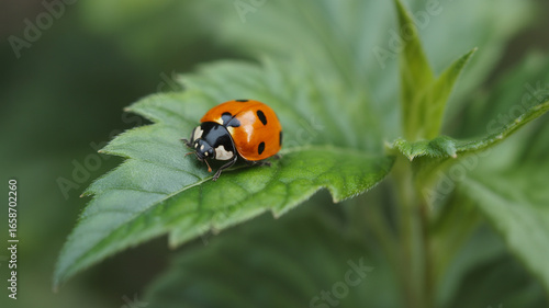 © Shahanaz, Fototapeta premium Close up macro photograph of a vibrant orange ladybug resting on a green leaf
