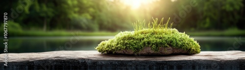 © pisan, Naklejka premium Close-Up Macro Photography of Lush Green Moss with a Soft Blurred Background of a Tranquil Forest and Lake, Capturing Intricate Texture and Natural Beauty, Perfect for Wallpaper, Desktop, or