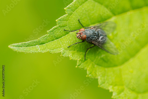 © Александр Овсянников, Naklejka premium Close-up macro shooting. The fly sits on a green leaf.