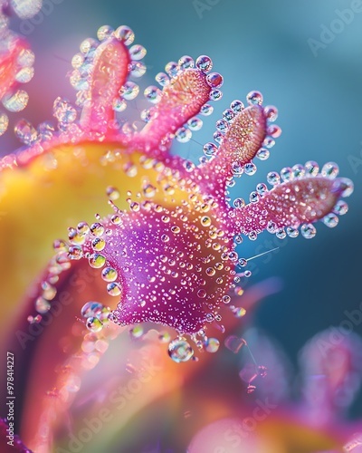 © Charoen, Naklejka premium Close-up macro shot of a pink flower covered in water droplets.