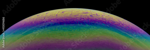 © Scalia Media, Obraz premium Close up, macro shot of a rainbow, multi colored soap bubble with yellow, purple, pink, blue and green colors on black background.