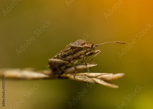 © Wirestock, Naklejka premium Close-up macro shot of a small insect perched atop a vibrant leaf of a plant.