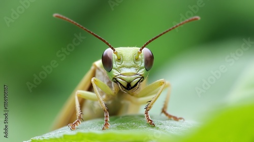 Fototapeta premium Close Up Macro Shot of Green Grasshopper on Leaf with Bokeh Background : Generative AI