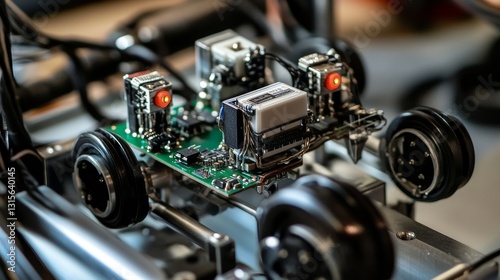 © Chaikit, Fototapeta premium Close-up macro shot of line-following robot assembly, exposed circuit board with soldered connections, dual infrared sensors mounted on front chassis, brushed DC motors with black rubber wheels,