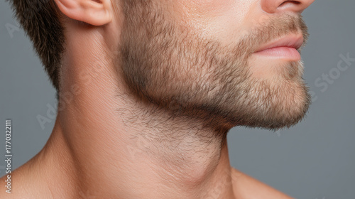 © Marut, Obraz premium Close up male jawline with stubble smooth skin light brown facial hair healthy complexion masculine profile freshly shaved neck natural texture confident expression studio lighting