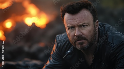 Obraz premium Close-up man in leather jacket, fire backdrop