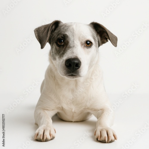 © Artcuboy, Obraz premium Close up mixed breed dog with white and gray fur one floppy ear lying on smooth white surface front paws visible head slightly tilted