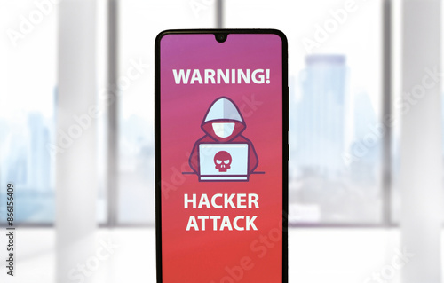 © Selman, Naklejka premium Close-up mobile "hacker attack" message. Office blur background.