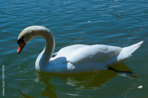 Naklejka premium close-up: mute swan with wholly white plumage with an orange beak bordered...