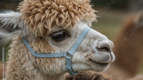 Obraz premium Close-up of a baby alpaca wearing a harness, showing its fluffy fur and...