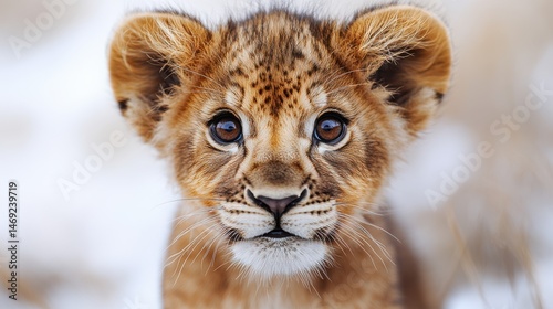 Fototapeta premium Close-up of a baby lion face, tiny whiskers visible, innocent gaze, pure...