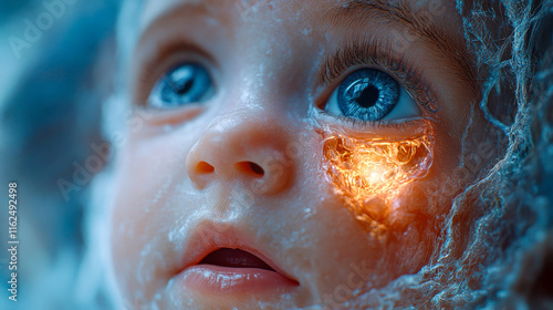 Fototapeta premium Close-up of a baby with glowing skin and illuminated anatomical structures. Hyperrealistic and artistic representation of life and energy