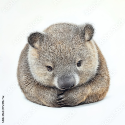 Fototapeta premium Close up of a baby wombat curled up on a white background looking adorable...