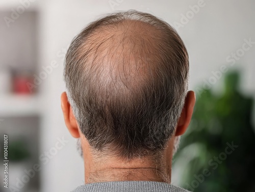 © aucartstudio, Fototapeta premium Close-up of a bald man seen from behind, serene indoor setting.