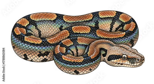 © cs, Obraz premium Close-up of a ball python snake with patterned scales isolated on white background, perfect for nature and wildlife projects