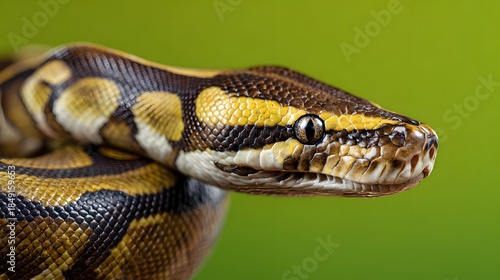 Fototapeta premium Close-up of a beautiful ball python with intricate patterns and vibrant colors against a green background.