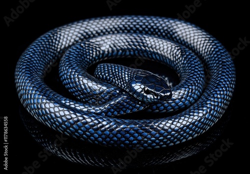 © ANUAR, Obraz premium Close-Up of a Beautiful Black and Blue Snake Coiled on a Reflective Surface Against a Dark Background, Highlighting Its Unique Scales and Patterns