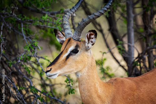 © Nadine, Naklejka premium Close up of a beautiful black faced impala under a tree, Namibia, Africa