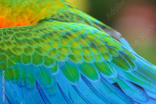 © Passakorn, Fototapeta premium Close-up of a beautiful colorful parrot feather.