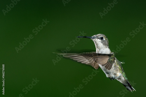 © clsdesign, Fototapeta premium Close up of a beautiful female ruby throat hummingbird hovering isolated on green with copy space