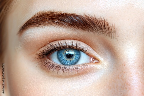 Obraz premium Close-up of a beautiful human eye showcasing vibrant blue iris, delicate lashes, and well-groomed eyebrow highlighting natural beauty.