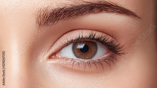 © Panida, Obraz premium Close-up of a Beautiful Human Eye with Brown Iris and Naturally Defined Eyelashes on a Smooth Skin Surface