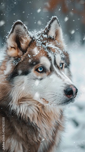 © Audy, Naklejka premium Close-up of a beautiful Husky with striking blue eyes, covered in fresh snowflakes during a gentle snowfall.