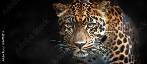 Naklejka premium Close-up of a beautiful leopard, solid black background, copy space.