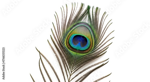 © Azan, Fototapeta premium Close up of a beautiful peacock feather with iridescent eye against a white background