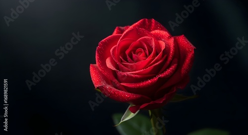 © Bery, Naklejka premium Close-up of a beautiful single red rose with water droplets on a dark, isolated background representing love and romance