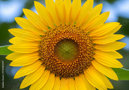 © Rizki, Fototapeta premium Close-up of a beautiful sunlit sunflower showcasing its golden petals and intricate Fibonacci spiral pattern in the center
