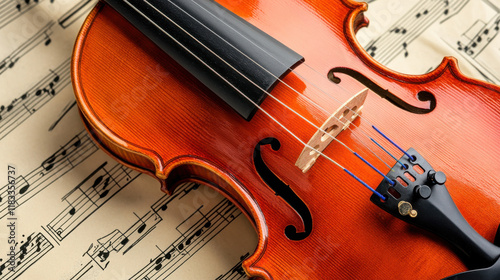Fototapeta premium Close-Up of a Beautifully Crafted Violin Resting on Sheet Music With Intricate Notes and Melodies, Perfect for Musical Themes and Art Projects