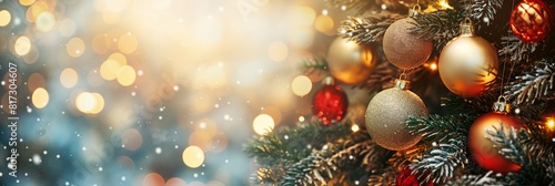 © gunzexx png and bg, Fototapeta premium Close-up of a beautifully decorated Christmas tree with baubles, sparkling lights, and a warm festive atmosphere