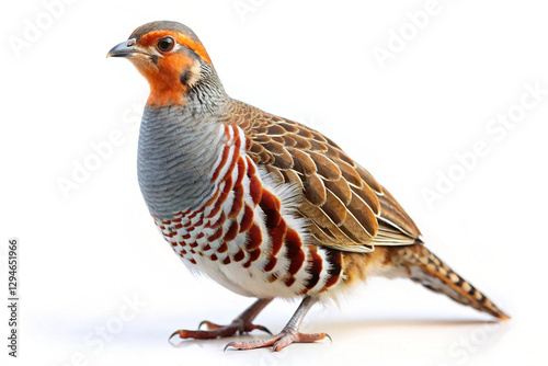 Fototapeta premium Close-up of a beautifully patterned partridge standing against a clean white...