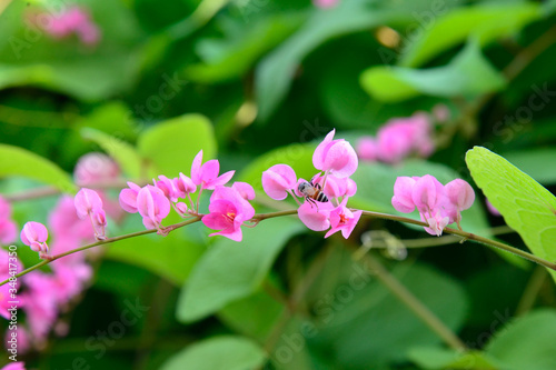 © Songkiet, Fototapeta premium Close up of a bee on a pink flower. Soft focus background. Green leaves background. Bee collecting honey. Blooming pink flower.