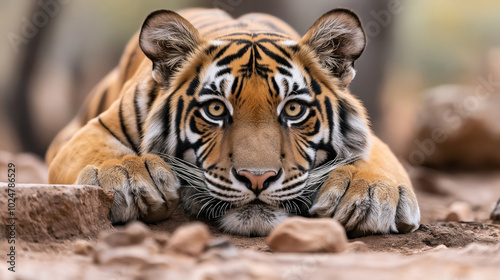 Fototapeta premium Close-up of a Bengal tiger lying on the ground with an intense gaze, displaying its distinctive orange fur with black stripes and large paws in a natural habitat.