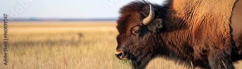 Obraz premium Close-up of a bison munching on tall prairie grass, with the expansive plains...