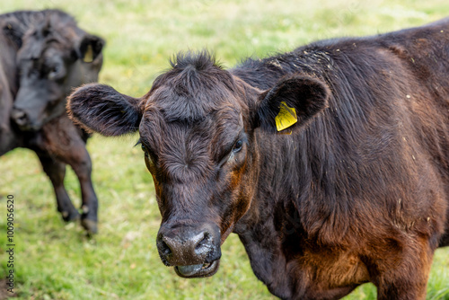 © Sven, Fototapeta premium Close-up of a black and tan cow with tagged ear in a grassy field, accompanied by another cow, she is looking directly at the camera, with tongue poking out while the other cow has its head turned