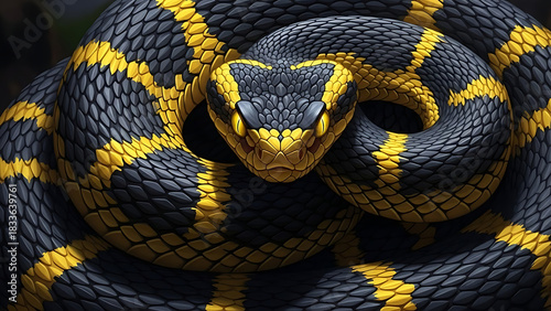 © Satrio, Obraz premium Close-up of a black and yellow patterned snake coiled with its head facing forward.