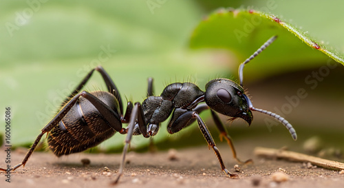 Fototapeta premium Close-up of a Black Ant on the Ground with Green Leaf Background