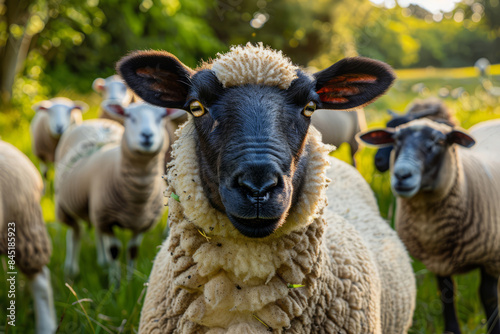 © thanakrit, Fototapeta premium Close-up of a black-faced sheep in a meadow, surrounded by a flock, showcasing wool and attentive gaze.