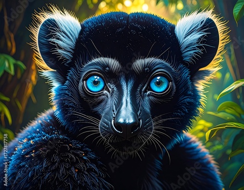 © Angger, Obraz premium Close-up of a black lemur with striking blue eyes. Jungle setting