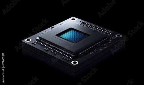 © Azril, Fototapeta premium Close-up of a black square computer chip on a circuit board, isolated on black background.