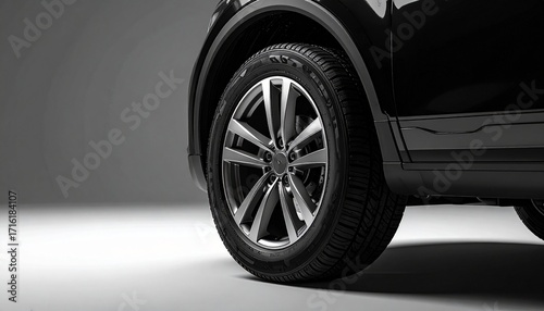 © xaras, Naklejka premium Close-up of a Black SUV Tire and Rim on a Gray Background with Copy Space