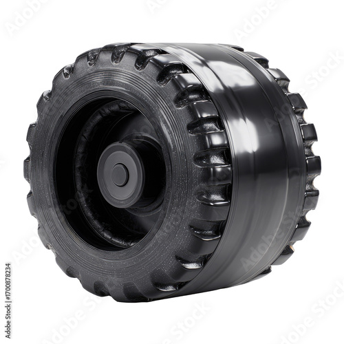 © Kadirun, Obraz premium Close-up of a black tire, likely for a toy vehicle. Deep treads, multiple layers, and a central hub