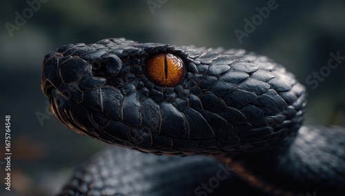 Fototapeta premium Close-up of a black venomous snake's head, focused on the intricate scales and bright orange eye. Dark, out-of-focus background of foliage