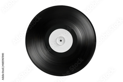 Obraz premium Close-up of a black vinyl record with a white label. The record's surface displays concentric grooves