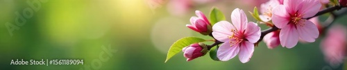 © Pornsuda, Naklejka premium Close-up of a blossoming branch, delicate pink flowers and vibrant green leaves, symbolizing renewal and healing Perfect for healthcare, wellness, and spring themes , wellness, pink
