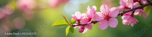 Fototapeta premium Close-up of a blossoming branch, delicate pink flowers and vibrant green leaves symbolizing renewal and healing, perfect for holistic health and wellness concepts , branch, flourishing, flora