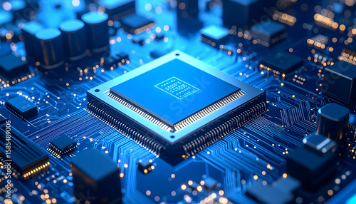 © MZR, Fototapeta premium Close Up of a Blue Computer Microchip on a Circuit Board